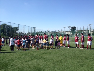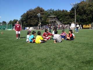 サッカー教室では、自己紹介も含んだランニングのウォーミングアップの後、一緒にミニゲームを行いました。