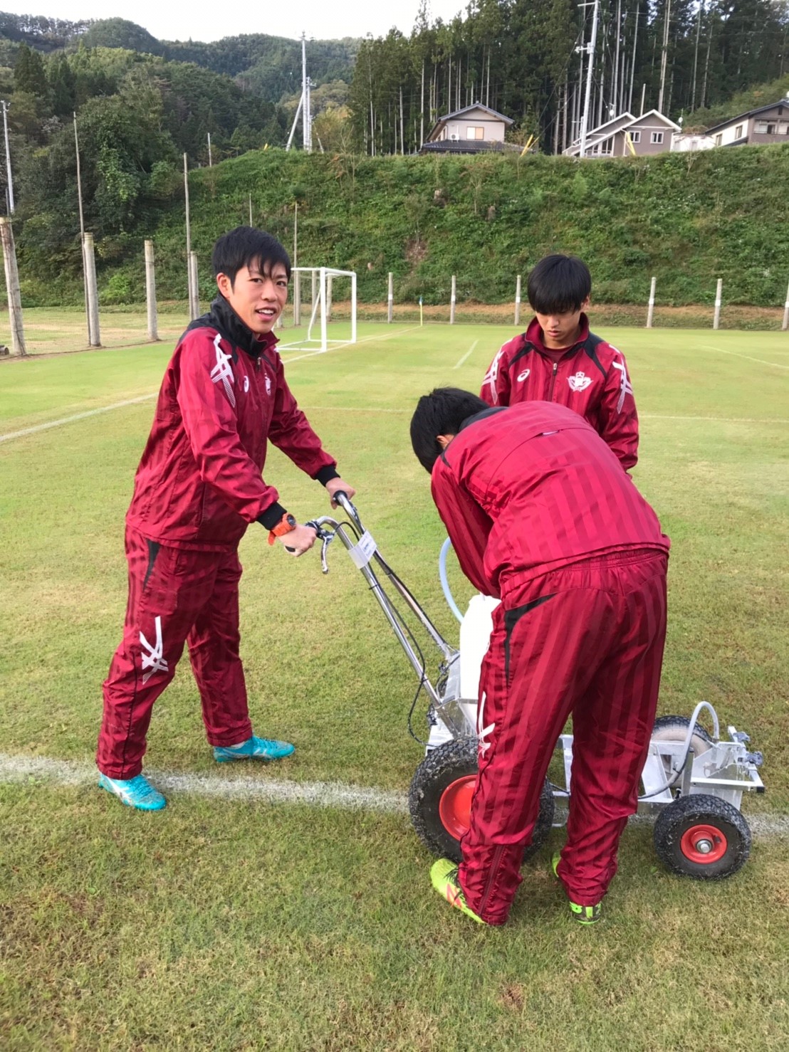 早朝にグラウンドに着き、まずはゴールの設置やライン引きなどの設営を行いました。