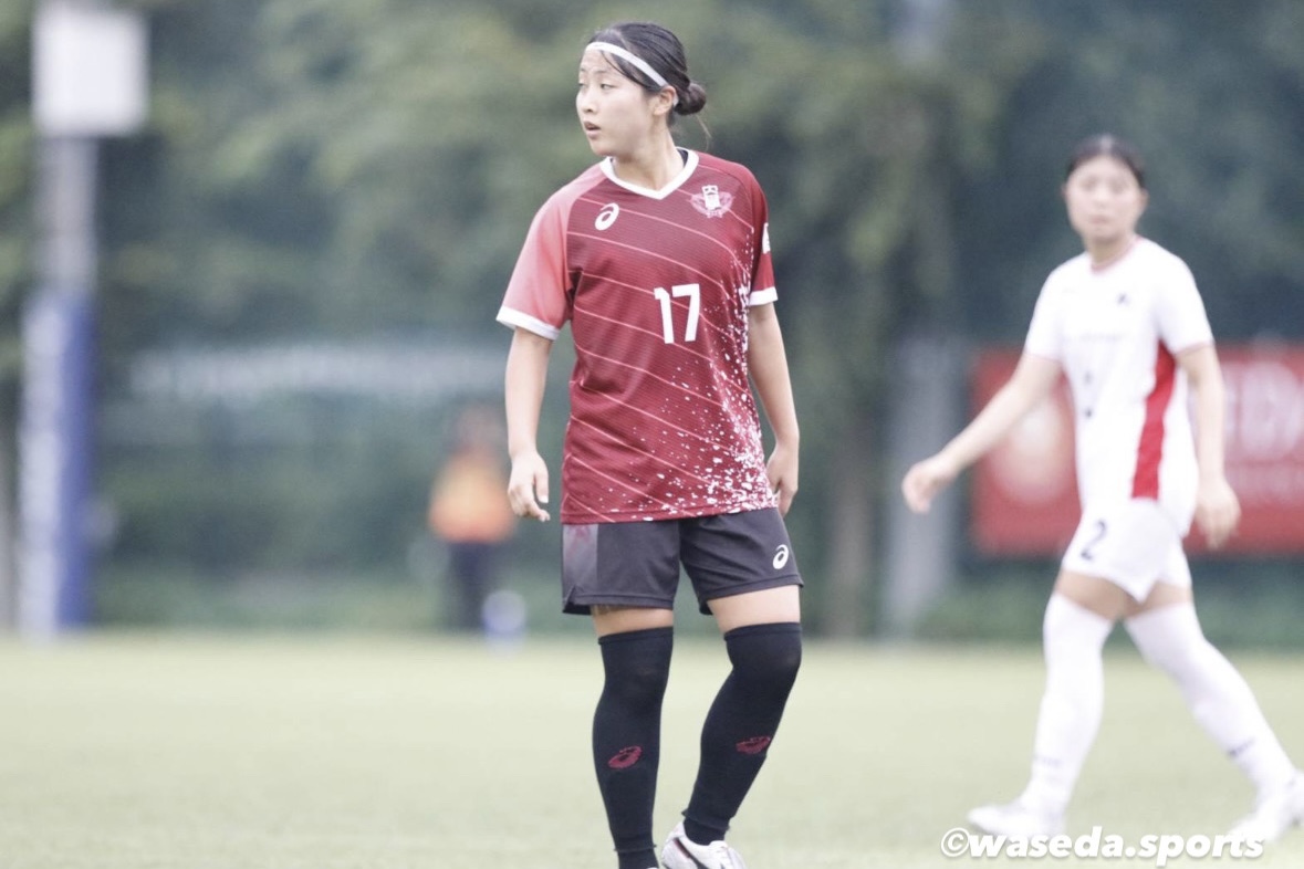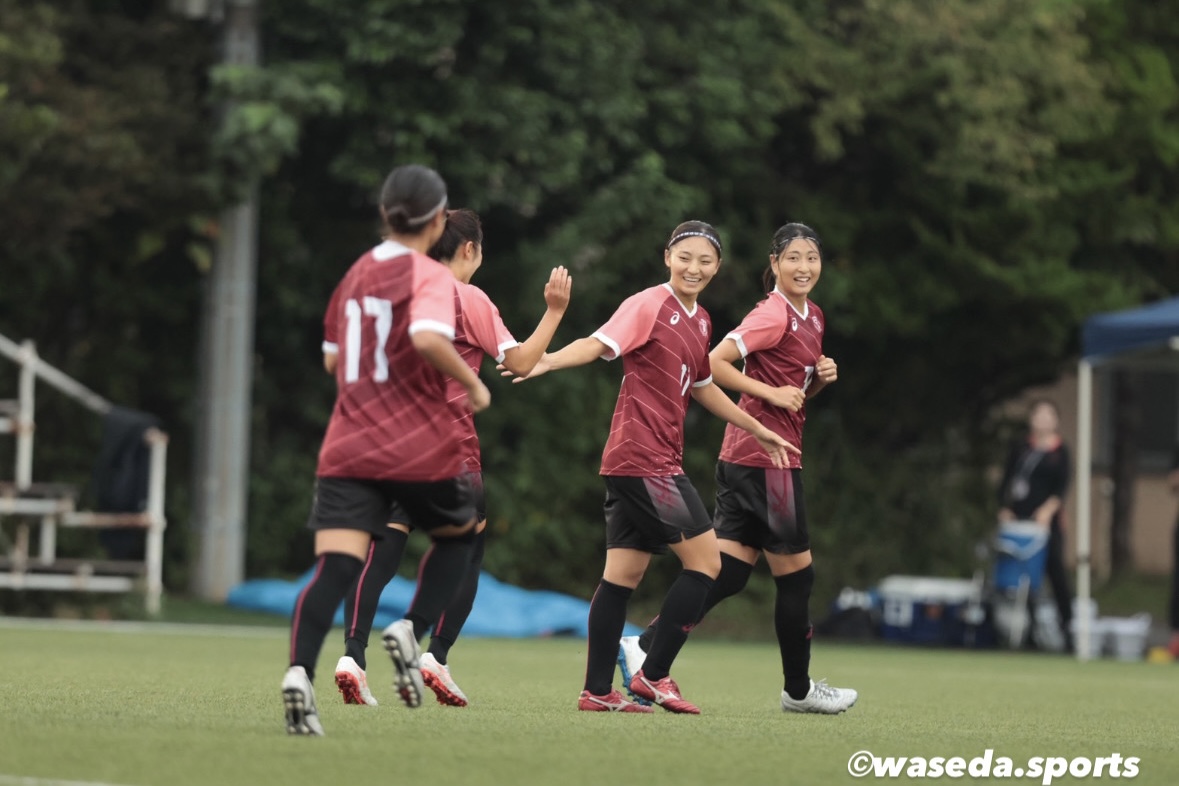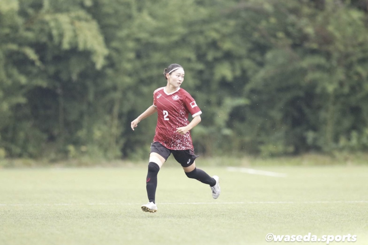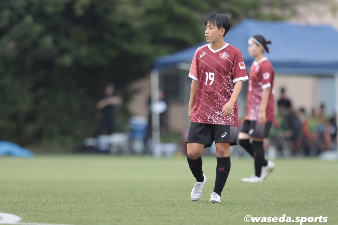 開始早々相手の勢いに飲まれ、自陣で守備をする時間が続く。13分、相手のCKをヘディングで押し込まれ失点。0-1となる。しかし4分後の17分、30吉田のサイドチェンジから右サイドでボールを受けた11三宅が中に切り込みミドルシュートを放つ。これがゴールに吸い込まれ同点ゴール。1-1とする。その後は徐々に早稲田がボールを回し始める。27分、13佐溝が獲得したCK、10宗形のボールに30吉田が合わせ、こぼれ球に19福岡が反応して押し込む。これが追加点となり2-1と逆転する。両チームともシュートまでいく拮抗した展開が続く。45+2分、自陣ペナルティエリアでのファールからPKを与えてしまい、失点。2-2で前半を終える。