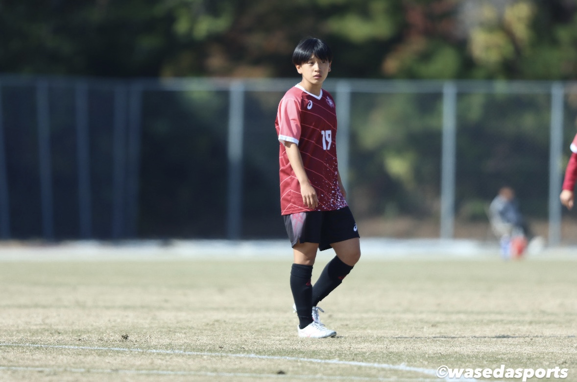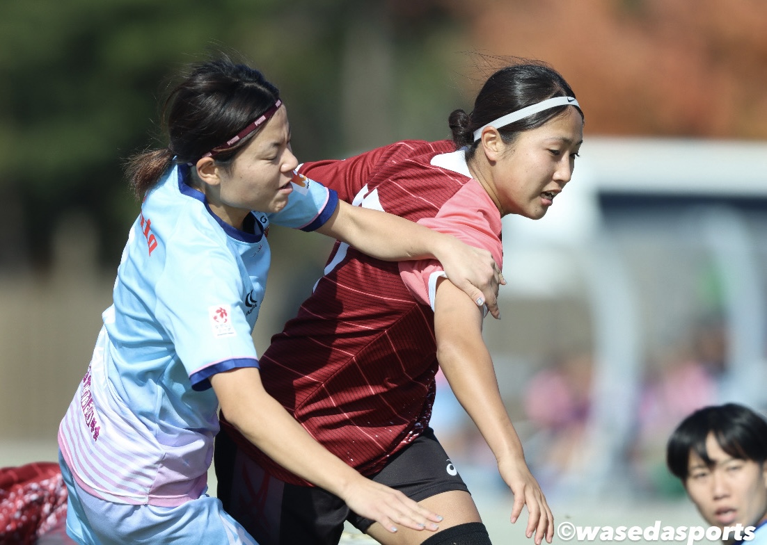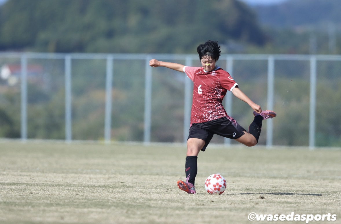 前半は早稲田ボールでキックオフ。13分、相手のロングスローからCKを与えてしまう。相手にシュートを何度も打たれるも1田村を中心に全員で体を張り、ゴールを割らせない。20分、相手CKを与えるも、1田村のセーブからクリアをし、右サイドにいた9生田にボールが渡る。9生田がドリブルで相手3人を突破し、シュートを放つが惜しくも得点には至らない。33分、9生田が右サイドでボールを持ち、低い弾道のクロスをあげる。ゴール前にいた6千葉がスルーをし、7﨑岡がシュートを放つ。しかし、惜しくも相手キーパーに弾かれ、ゴールネットを揺らすことができない。40分、高い位置でのスローインからペナルティエリア付近中央にいた9生田にボールが繋がる。ミドルシュートを放つが惜しくもゴールとはならない。そして試合は動かないまま0-0で前半を終える。