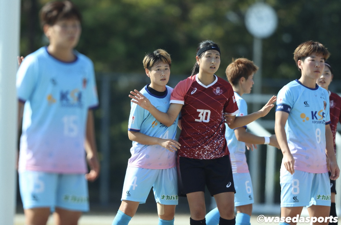HTでビルドアップの立ち位置の修正を行い、先制点を奪いに行こうと後半に挑む。また、2新井→11三宅の交代を行う。59分、3杉山の精度の高いロングボールが9生田に渡る。そのままシュートを放ち、相手にブロックされるもCKを獲得。ニアの低いボールに合わせるも、惜しくも相手GKに防がれ、得点には至らない。72分、6千葉→13佐溝の交代を行う。77分、7﨑岡から13佐溝にボールが繋がる。自らターンしミドルシュートを放つが、惜しくも相手キーパーにキャッチされ得点とはならない。続く79分、30吉田のロングボールを相手がクリアし、CKを獲得。10宗形のボールに13佐溝が合わせるが惜しくも枠を外れ、得点とはならない。80分に25小林→24福島、そして90+3分に9生田→23小島の交代を行う。0-0のまま試合は動かず、15分ハーフの延長戦となる。