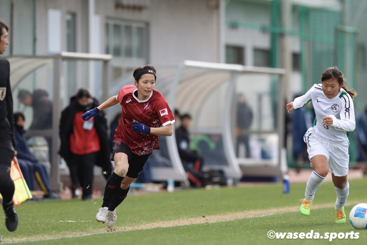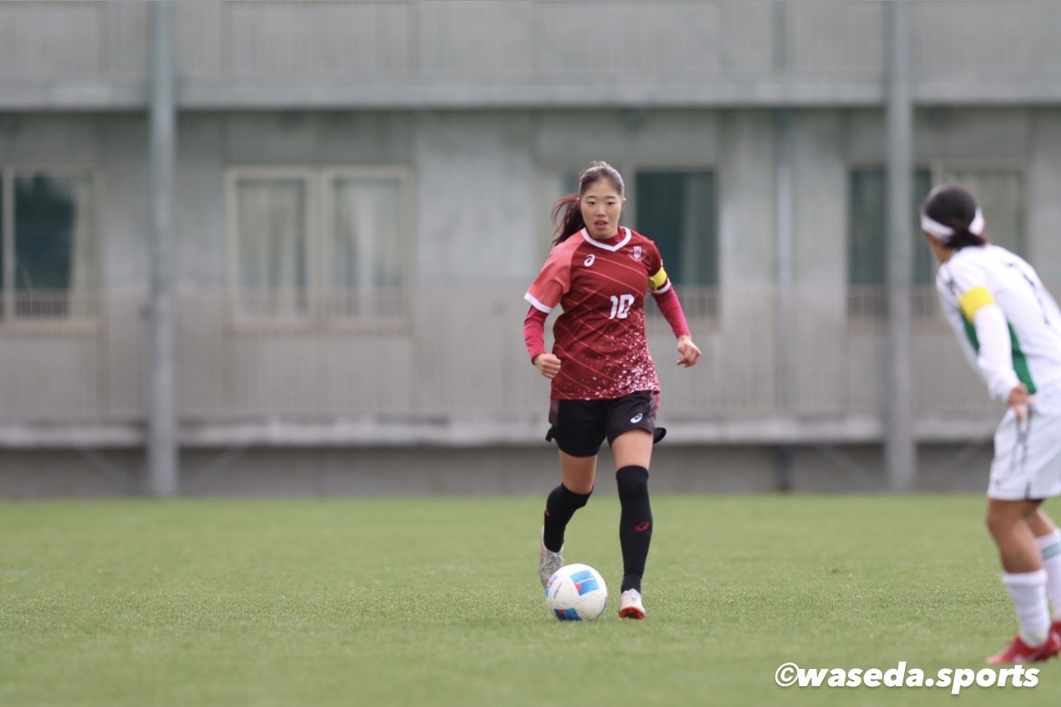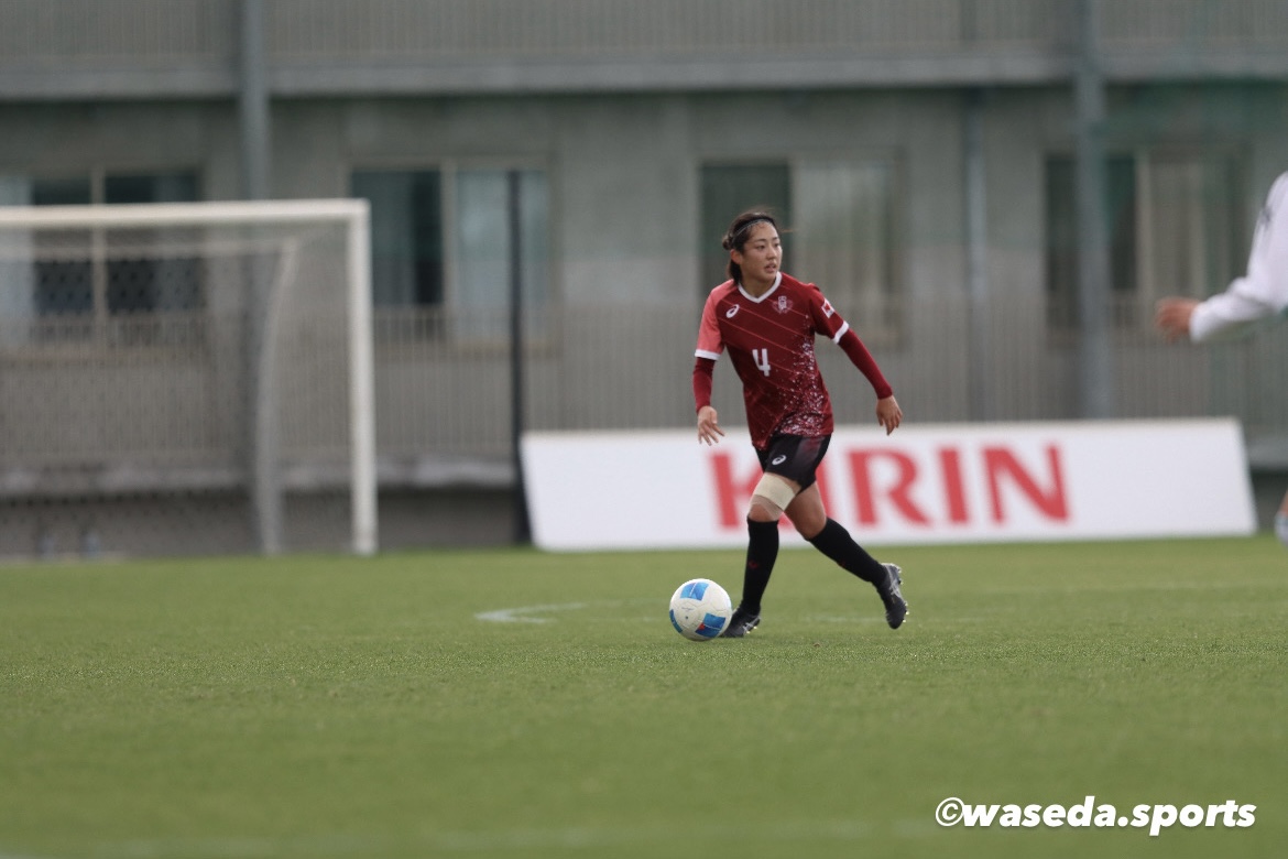 前半は早稲田ボールでキックオフ。3分、自陣左を攻め込まれ相手にCKを与えてしまうも、16勝間田の冷静なキャッチで失点を防ぐ。早稲田がボールを保持する時間が続くも、決定的なチャンスを作ることができず、拮抗した試合展開となる。25分、17米村から9生田にロングパスが出てゴールに向かう。こぼれ球を2新井が拾い9生田にパスをするも、最終的にオフサイドになってしまう。30分、4小林から11三宅へロングパスが渡る。11三宅がカットインからシュートを放つも、キーパーに止められる。