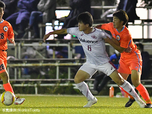 前半、試合は開始早々動く。7分、早稲田12森のクロスに28駒沢がヘディングで合わせ、幸先良く先制に成功する。14分、相手にペナルティエリアに侵入されシュートを放たれるも、早稲田31上川がセーブする。早い段階での追加点が欲しい早稲田は19分、再び12森のクロスに28駒沢が足で合わせるも、相手GKに阻まれる。22分早稲田19安斎がペナルティエリア付近からシュートを放つも、相手キーパーに阻まれる。その後は互いに譲らず、拮抗した時間帯が続く。34分、相手のミドルシュートに早稲田31上川が反応し、ゴールを割らせない。前半の終盤には相手にボールを握られ、苦しい時間帯が続くも、早稲田4小倉、5鈴木のセンターバックコンビ中心に相手の攻撃を抑え、1-0で前半終了。