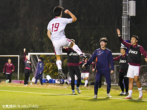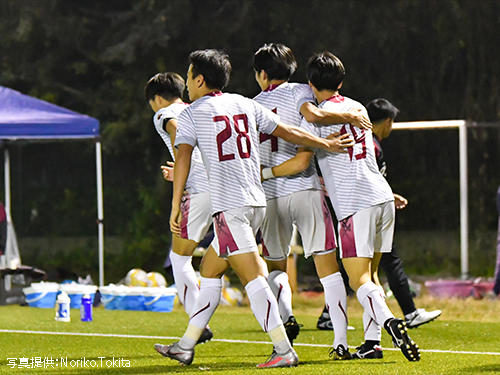 後半、攻勢を強めたい早稲田は2分、14田部井のクロスをフリーで受けた30杉田がシュートを放つも、決めきることができない。その後のコーナキックのこぼれ球を、19安斎、13平松が立て続けにシュートを放つが、枠を捉えられない。8分、左サイドでボールを受けた19安斎がドリブルでペナルティエリアに侵入するとそのままシュート。これが決まり、リードを2点に広げる。攻撃の手を緩めない早稲田は22分、こぼれ球に反応した14田部井がシュートを放つも、キーパー正面。その後は、拓殖大に押し込まれる時間が続くが、31上川を中心とした守備で失点を許さない。36分にはコーナキックを頭で合わせられるが6大西がゴールラインぎりぎりのところでクリア。このまま最後まで集中を切らさず、2-0で試合終了。