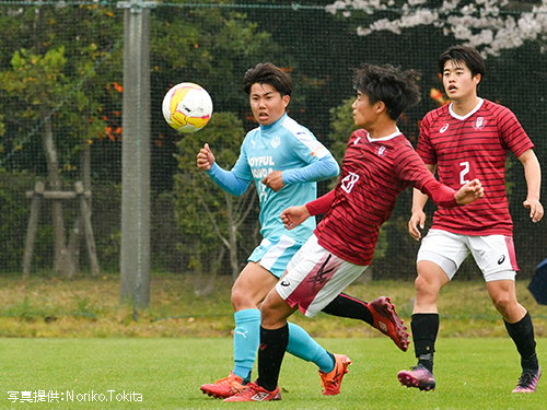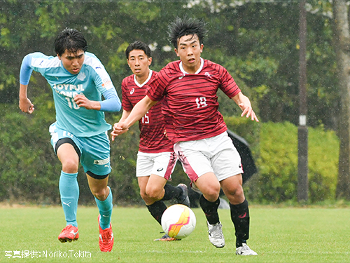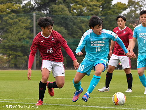 前半序盤は拮抗した展開が続く。前半10分、縦突破した早稲田2森がクロスを上げるが中には合わない。前半13分、中盤から崩し、サイドでフリーになった早稲田3柴田がクロスを上げるも中とは合わない。前半23分、早稲田11西堂のクロスのこぼれ球を28丹羽が左足でボレーするもポストに弾かれる。前半終了間際の前半43分には、早稲田2森のマイナスのクロスに6平松が合わせるも枠を外れる。そのまま、0-0で前半終了。