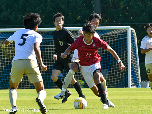 序盤から早稲田がチャンスを作る。前半7分、早稲田15森のクロスに18駒沢が合わせるも、惜しくも枠を外れる。その1分後、相手ゴール付近でボールを奪った早稲田18駒沢が冷静にゴール左隅に流し込み、先制に成功する。その後は相手にボールを保持される展開が続く。前半11分、裏に抜け出した順天堂11にシュートを打たれるも、早稲田31平田周のセーブで得点を許さない。前半22分、エリア内にドリブルで侵入した早稲田2平瀬のパスに反応した18駒沢がシュートを放つも、得点には結びつかない。追加点を奪いたい早稲田だったが、前半34分、38分と立て続けに失点し、逆転を許してしまう。その後は試合が動かずそのまま1-2で前半終了。