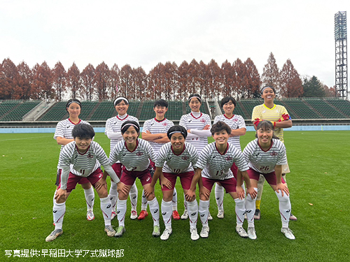 後半は相手ボールでキックオフ。52分、相手にドリブルでペナルティエリア内に侵入され、シュートを放たれるもゴール上へ外れ、失点を免れる。58分、右サイドでボールを奪った10髙橋からパスを受けた14笠原がシュートを放つも枠をとらえられない。続けて59分、右サイド7三谷からクロスボールが上がり、11吉野が相手を背負いながらターンしてシュート放つ。これは、惜しくも相手GKの好セーブに阻まれる。66分には再びチャンスが訪れる。26宗形から7三谷へ大きくサイドチェンジ。7三谷がペナルティエリア内に侵入し、マイナスのクロスを入れ、14笠原が合わせるもゴール上へ。チャンスが続く時間帯で追加点が欲しいア女。しかし69分、相手にコーナーキックを与え、ヘディングで合わせられ失点。1-1で試合は振り出しとなる。その後、下を向くことなく切り替えて点を奪いにいきたい。75分、相手に裏に抜け出されるも、2夏目のカバーでピンチを防ぐ。すると76分、幾度もチャンスを作り出してきた7三谷が右サイドから上げたクロスに19築地がヘディングで合わせ、ネットを揺らす。2-1で再びア女がリード。85分、7三谷→18白井の交代を行う。相手が勢いを持って攻めてくる中、集中を切らさず最後まで走り、戦い続け2-1で試合終了。