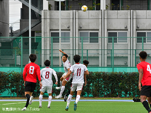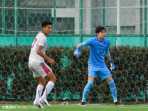 前半立ち上がりからロングボールを多用した相手の攻撃が続くが、27神橋、1ヒルを中心とした守備でゴールを割らせない。次第に、8福井を中心にボールを握り始めてペナルティエリア付近まで前進するも駒澤大の守備に阻まれてしまい、シュートまで持っていくことができない。その後は、両者譲らず拮抗した展開が続く。前半34分にセットプレーのこぼれ球をシュートされるが、1ヒルがしっかりと防ぐ。前半終盤には駒澤大がロングスローを中心とした攻撃を仕掛けてくるものの、集中したプレーで決定機を作らせずに0-0で前半終了。