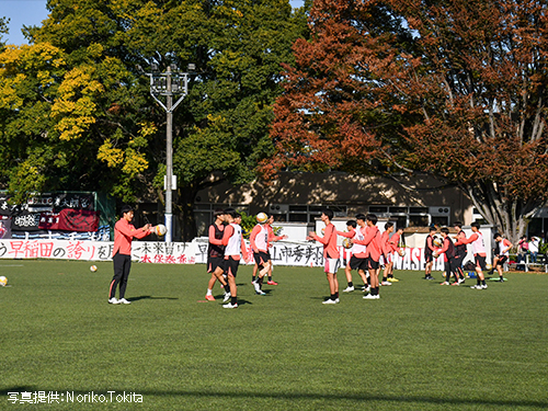 関東大学サッカーリーグ2部最終節、相手は神奈川大。別会場では勝ち点3差で追いかける首位の法政大、2位の駒澤大の直接対決。勝てば1部昇格の可能性が大きくある。勝利が昇格へ絶対条件の早稲田は目の前の試合に集中し、勝利を収めたい。