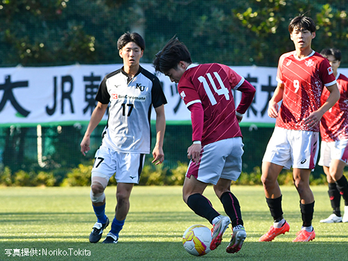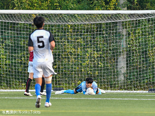前半4分、神奈川大のフリーキックはゴール上に外れる。以降、神奈川大がボールを握りパスを回して攻めてくるが、早稲田はゴール前の集中した守備でチャンスを作らせない。前半19分、早稲田10山市が20久米にパスを差し、そのままターンしてシュートを放つが相手DFにブロックされる。前半途中、互いに拮抗した展開が続く。前半26分、ゴールエリア横で14森田が抜け出しクロスを上げ、20久米がヘディングで合わせるもわずかにゴール横に逸れる。早稲田はテンポ良くパスを回し、ボールを握る。前半34分、神奈川大のコーナーキックで、ニアにグラウンダーのボールを上げられるも、20久米がクリアする。神奈川大はセンターバックを起点にパスを差してくる。早稲田はそのパスに対して強くプレッシャーをかけ、ボールを前に運ばせない。一方、早稲田は攻撃でなかなかボールを繋ぐことができず、シュートまで持っていくことができない。両チームが互いに攻撃をシャットアウトし、シュートを打たせない。前半44分、10山市が鋭いスルーパスを出すも相手DFに触られ、惜しくもパスが通らない。前半45+1分、10山市のワンタッチの縦パスを受けた11本保が振り向きざまにシュートを放つもゴール上に外れる。