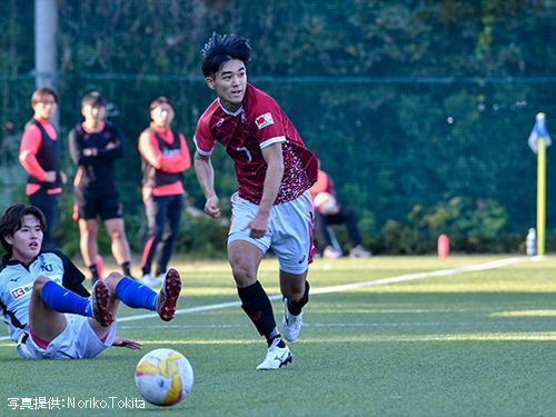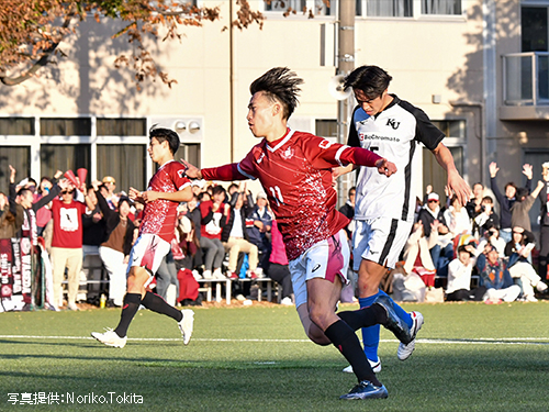 後半6分、右サイドの早稲田7西のクロスから14森田が合わせるも当たりきらず、ゴール左に逸れる。後半10分、30尾崎のフィードから20久米が抜け出しコーナーキックを獲得する。そのコーナーキックは相手に弾かれる。後半12分、神奈川大に左サイドからカットインされシュートを放たれるが、ゴールポストに救われる。後半13分、神奈川大のコーナーキックが直接ゴールに向かってくるが、21海本がパンチングでかき出す。球際の激しい奪い合いが繰り広げられる。後半18分、相手ゴール前で怒涛の攻撃を仕掛けるが、中央を堅く守られ、シュートまでは持っていけない。後半19分、30尾崎がミドルシュートを放つが相手GKにセーブされる。後半24分、6柏木のクロスから10山市が胸トラップで抜け出し、冷静に流し込んで先制する。後半28分、6柏木のスルーパスに11本保が抜け出し、ゴール左に流し込んで追加点を挙げる。後半、10山市を中心に集中力を保ち、相手にプレッシャーをかけ続ける。ゴール前でも堅い守備でチャンスを作らせない。後半43分、相手に裏に抜け出されキーパーと一対一になるが、21海本が咄嗟の反応でループシュートをセーブする。最後まで集中して守り通し、試合は2-0で勝利。一部昇格を決めた。