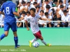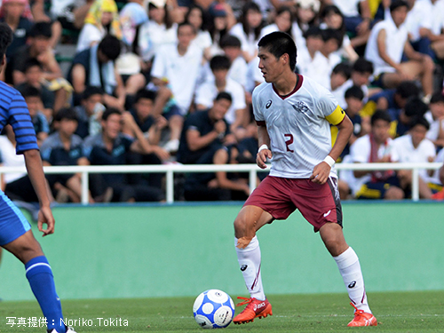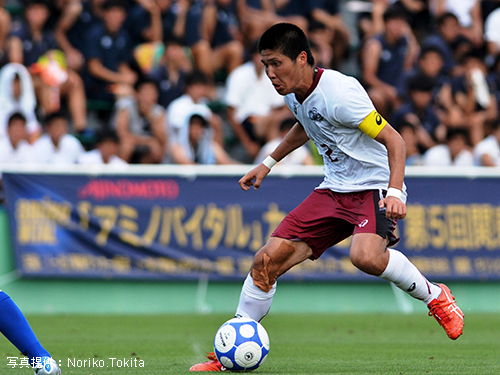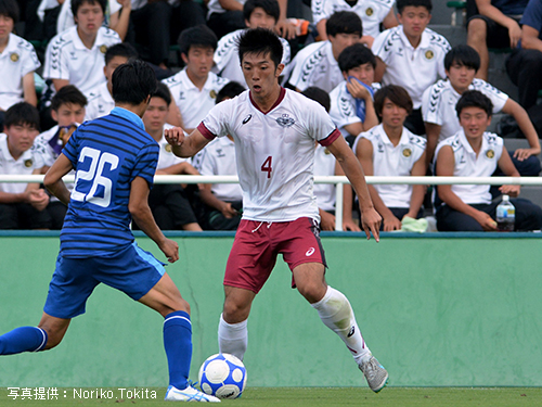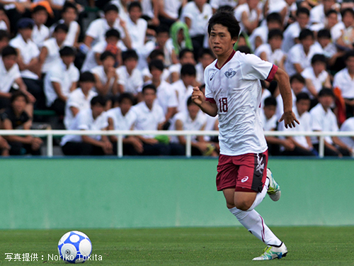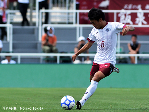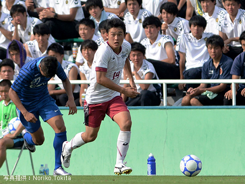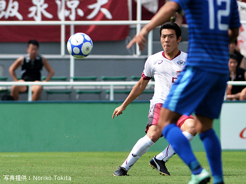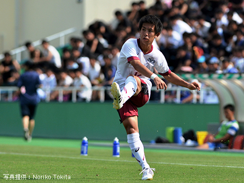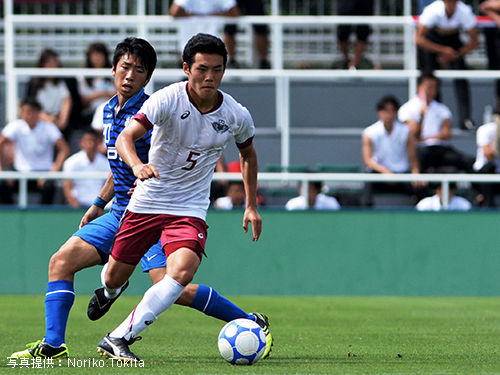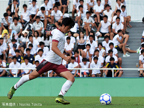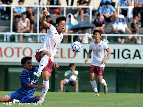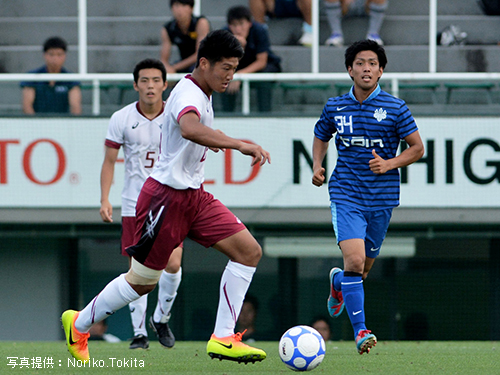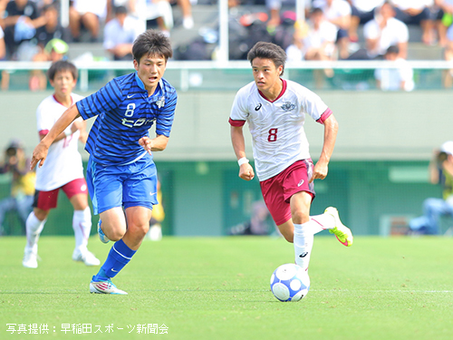 ボールを回して試合を支配しようする桐蔭横浜に対し、早稲田はボールを奪ったら縦に速い展開でゴールに迫った。均衡した展開であったが、前半終了間際の38分、2新井のグラウンダーのクロスに13今来がダイレクトで合わせ、 先制に成功する。