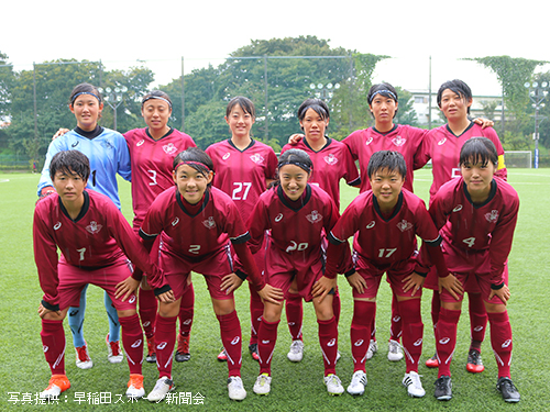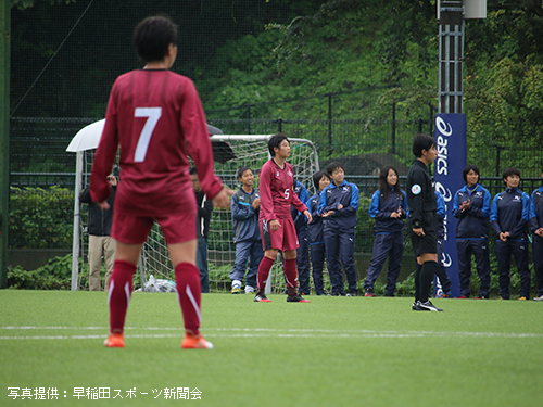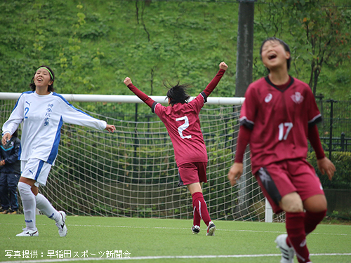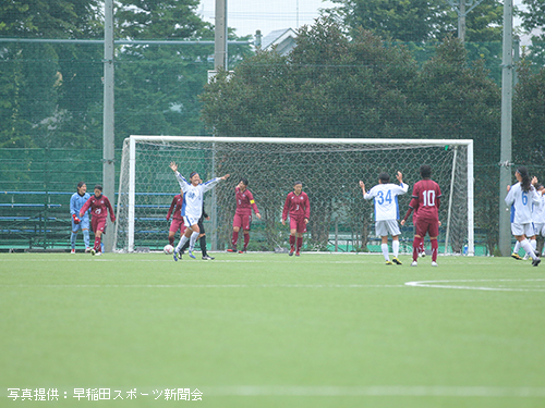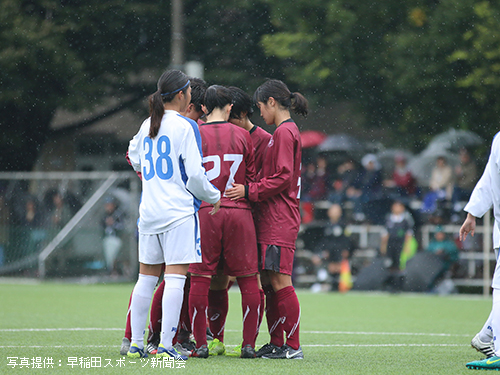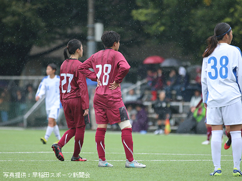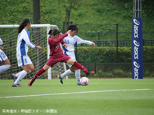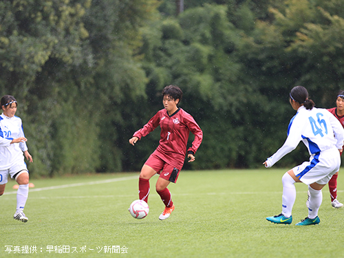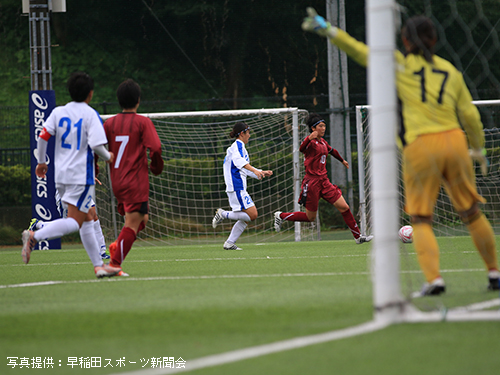 立ち上がりから相手を圧倒したいア女だが、濡れたピッチに順応するまでに時間がかかり、なかなかうまくいかない。ビルドアップの途中でパスミスなどのイージーミスが目立ち、相手に簡単にボールを与えてしまう。しかし流れの中でチャンスを幾度か作れていたア女は前半14分、9平國の右サイド突破からCKを獲得。ゴール前の混戦から7河野が泥臭く押し込みゴール。貴重な先制点を挙げ1-0とする。このまま勢いに乗りたいア女であったが、そう簡単にプレーさせてくれない相手。前半16 分、相手の抜け出しからゴール前まで迫られるも、1木付をはじめとする早稲田DF陣の身体を張ったセーブにより九死に一生を得るなど、相手にチャンスを与えてしまう。しかし前半33分、左サイドで受けた2渡部が右足で華麗に放ったシュートはゴール右上に吸い込まれる。2-0とし、相手を突き放す。何度か危ない場面があったものの、集中力を切らさずに得点を狙い続けたア女は2-0とリードしたまま前半を終える。